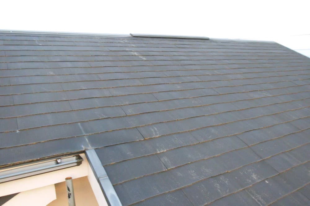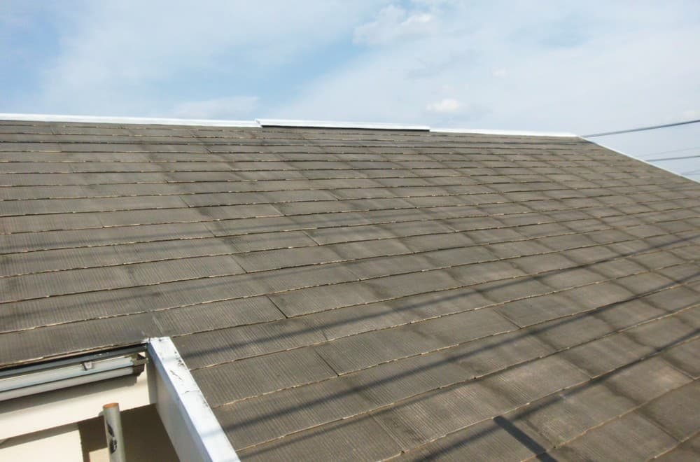 施工前:施工前は、屋根についている苔や錆などの汚れが付いています。場合によってはヒビが入っている個所もあったりするのでそれも確認していきます。